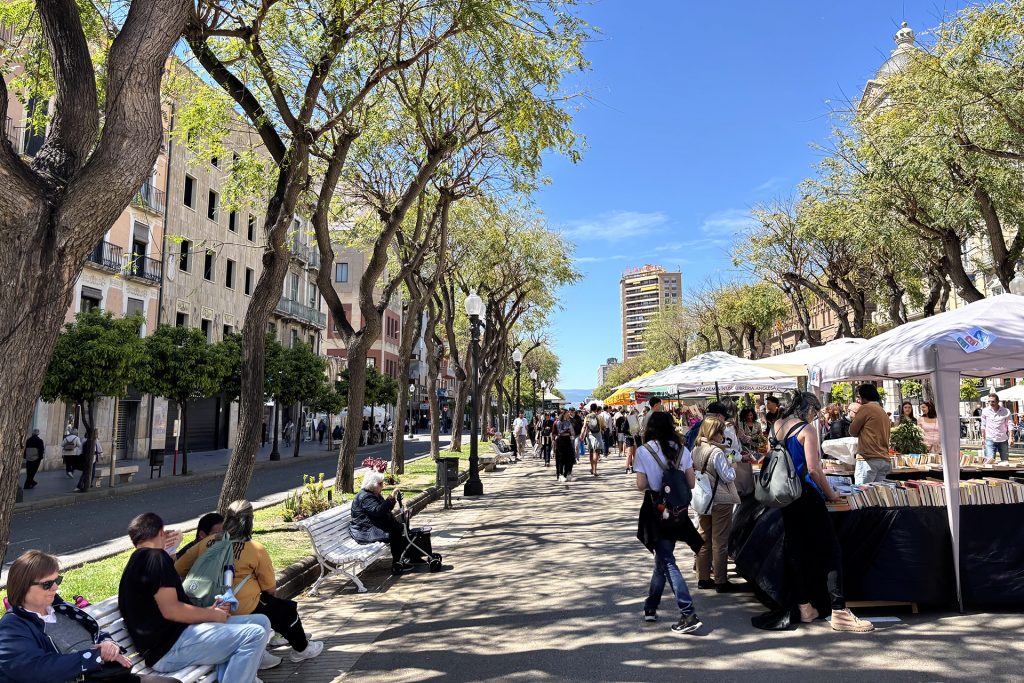 La Rambla Nova concentra més de 150 parades de llibres i roses. És l’eix principal de la jornada, on conviuen llibreters, floristes i entitats socials de la ciutat.